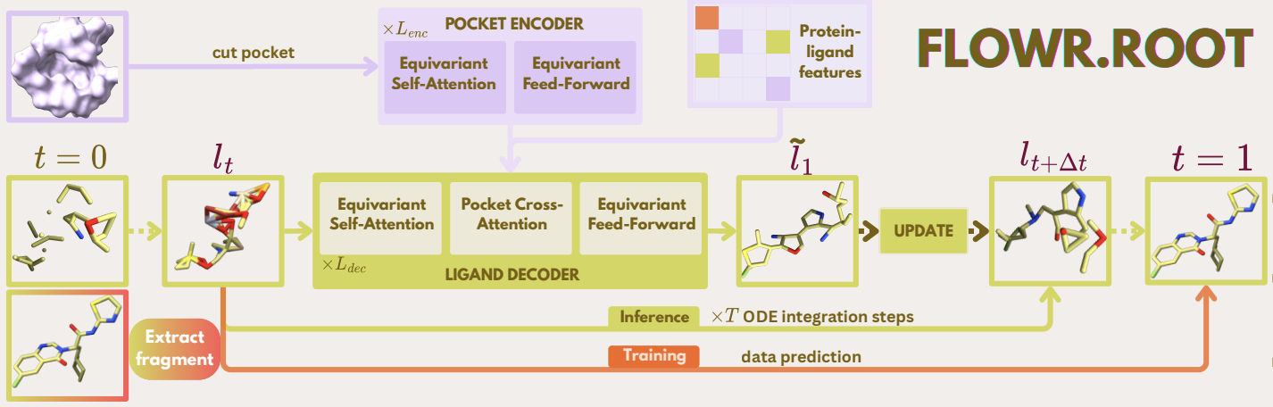 multi-purpose structure-aware 3D ligand generation and affinity predictionJulian Cremer*, Tuan Le, Mohammad M. Ghahremanpour, Emilia Sługocka, and 2 more authors2025We present FLOWR:root, an equivariant flow-matching model for pocket-aware 3D ligand generation with joint binding affinity prediction and confidence estimation. The model supports de novo generation, pharmacophore-conditional sampling, fragment elaboration, and multi-endpoint affinity prediction (pIC50, pKi, pKd, pEC50). Training combines large-scale ligand libraries with mixed-fidelity protein-ligand complexes, followed by refinement on curated co-crystal datasets and parameter-efficient finetuning for project-specific adaptation. FLOWR:root achieves state-of-the-art performance in unconditional 3D molecule generation and pocket-conditional ligand design, producing geometrically realistic, low-strain structures. The integrated affinity prediction module demonstrates superior accuracy on the SPINDR test set and outperforms recent models on the Schrodinger FEP+/OpenFE benchmark with substantial speed advantages. As a foundation model, FLOWR:root requires finetuning on project-specific datasets to account for unseen structure-activity landscapes, yielding strong correlation with experimental data. Joint generation and affinity prediction enable inference-time scaling through importance sampling, steering molecular design toward higher-affinity compounds. Case studies validate this: selective CK2α ligand generation against CLK3 shows significant correlation between predicted and quantum-mechanical binding energies, while ERα and TYK2 scaffold elaboration demonstrates strong agreement with QM calculations. By integrating structure-aware generation, affinity estimation, and property-guided sampling, FLOWR:root provides a comprehensive foundation for structure-based drug design spanning hit identification through lead optimization.