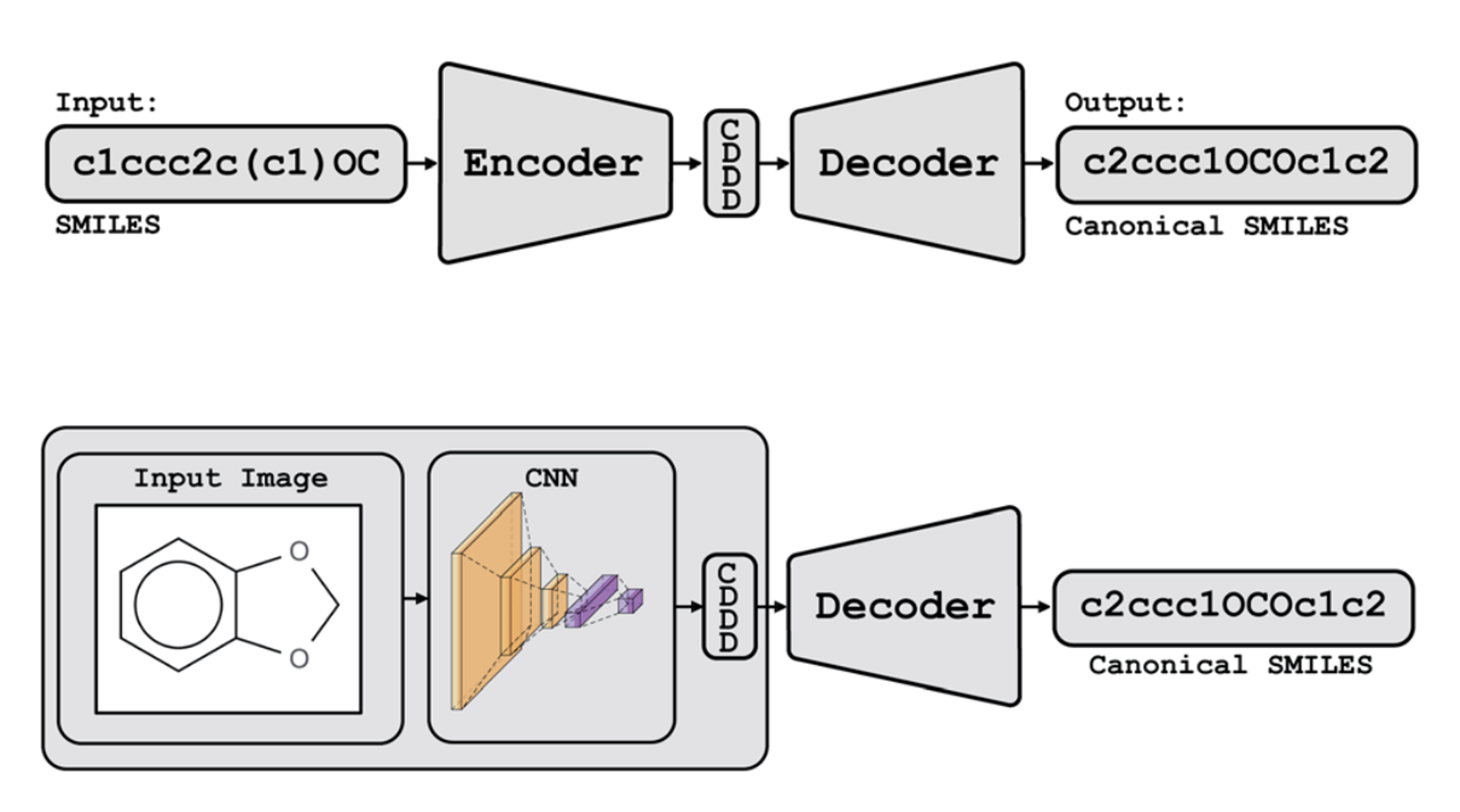Img2Mol - Accurate SMILES Recognition from Molecular Graphical DepictionsChem. Sci. May 2021"Automatic recognition of the molecular content of a molecule’s graphical depiction is an extremely challenging problem that remains largely unsolved despite decades of research. Recent advances in neural machine translation enable the auto-encoding of molecular structures in a continuous vector space of fixed size (latent representation) with low reconstruction errors. In this paper, we present a fast and accurate model combining a deep convolutional neural network learning from molecule depictions and a pre-trained decoder that translates the latent representation into the SMILES representation of the molecules. This combination allows to precisely infer a molecular structure from an image. Our rigorous evaluation show that Img2Mol is able to correctly translate up to 88% of the molecular depictions into their SMILES representation. A pretrained version of Img2Mol is made publicly available on GitHub for non-commercial users."