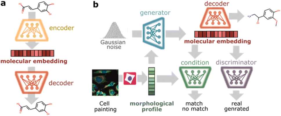 on phenotypic image featuresPaula A. Marin Zapata*, Oscar Méndez-Lucio*, Tuan Le, Carsten Jörn Beese, and 3 more authorsDigital Discovery May 2023Developing novel bioactive molecules is time-consuming, costly and rarely successful. As a mitigation strategy, we utilize, for the first time, cellular morphology to directly guide the de novo design of small molecules. We trained a conditional generative adversarial network on a set of 30 000 compounds using their cell painting morphological profiles as conditioning. Our model was able to learn chemistry-morphology relationships and influence the generated chemical space according to the morphological profile. We provide evidence for the targeted generation of known agonists when conditioning on gene overexpression profiles, even though no information on biological targets was used during training. Based on a target-agnostic readout, our approach facilitates knowledge transfer between biological pathways and can be used to design bioactives for many targets under one unified framework. Prospective application of this proof-of-concept to larger chemical spaces promises great potential for hit generation in drug and phytopharmaceutical discovery and chemical safety.