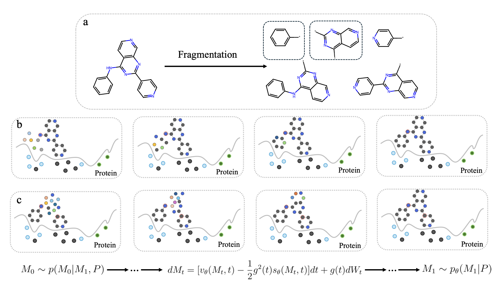 Coupled fragment-based generative modeling with stochastic interpolantsTuan Le*, Yanfei Guan, Djork-Arné Clevert, and Kristof T SchüttOct 2025Fragment-based drug design (FBDD) has become a key approach in structure-based drug discovery, allowing researchers to systematically develop molecular fragments into potent ligands. Although recent generative AI models, such as diffusion-based approaches, show great potential for designing new molecules, applying them to fragment-based methods faces challenges due to mismatches between training and inference procedures, as well as computational limitations. In this work, we develop a generative model based on stochastic interpolants that unify diffusion and flow matching paradigms, learning to create fragments through conditional training on molecular substructures. Our experiments show that models trained with explicit fragment-based conditioning perform much better than unconditional models that are adapted for fragment completion tasks. We compare diffusion models with flow matching models using identical backbone architectures and find that flow matching delivers better convergence and produces higher-quality 3D molecular poses with reduced strain energies, all while needing fewer computational steps. We test our method on standard benchmark datasets and examine different fragmentation strategies, finding that the choice of fragmentation algorithm plays an important role in model performance. Through a detailed case study on an internal PLK3 inhibitor structure, we demonstrate that our approach can generate new fragments that show computationally favorable docking scores and binding energy estimates competitive with tested internal Pfizer compounds, while also exploring regions of chemical space that go beyond existing fragment libraries. These findings establish flow matching within the stochastic interpolants framework as a promising approach for fragment-based drug design, providing both improved computational efficiency and better molecular quality for structure-based optimization.